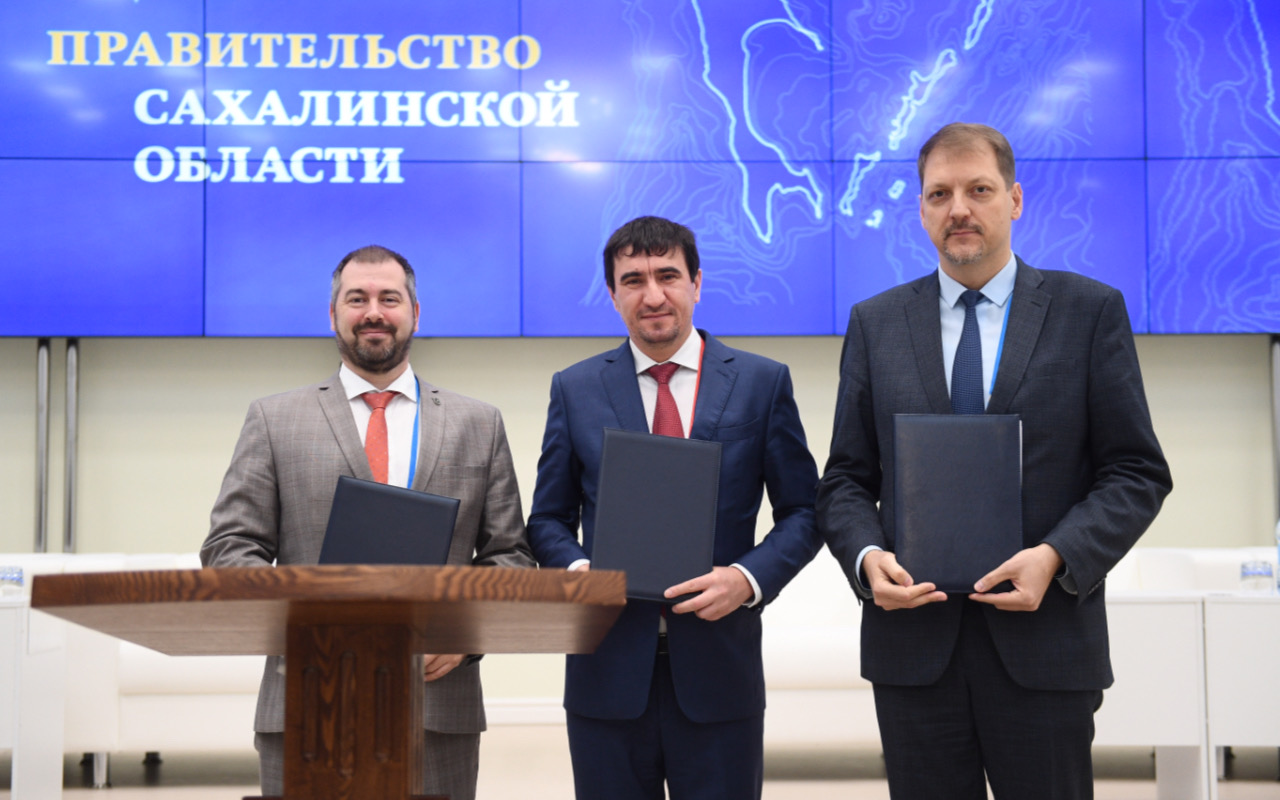 Трехстороннее соглашение подписали министр цифрового и технологического развития Сахалинской области Александр Снегирев, проректор СахГУ Николай Хурчак и заместитель генерального директора РЕД СОФТ Рустам Рустамов.
